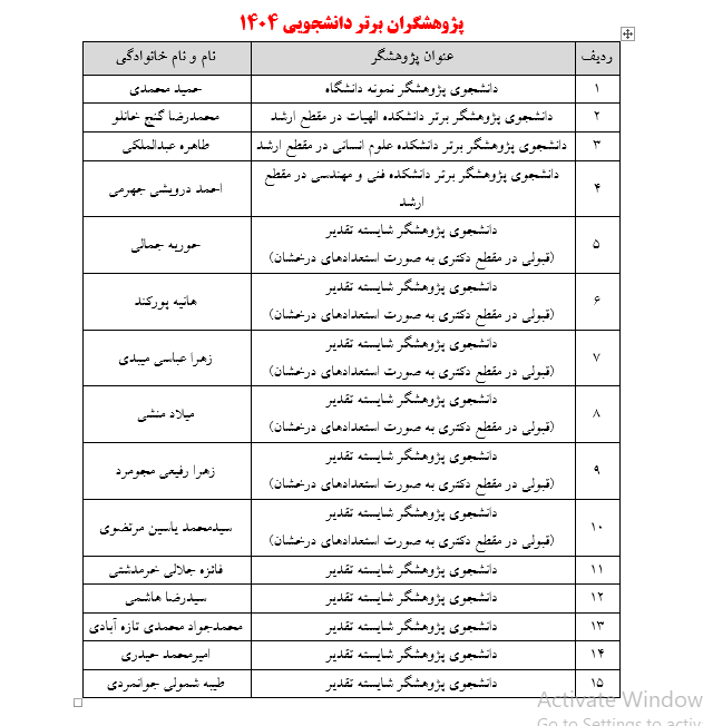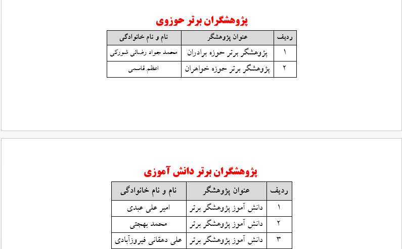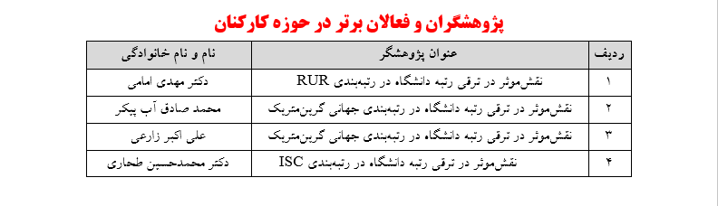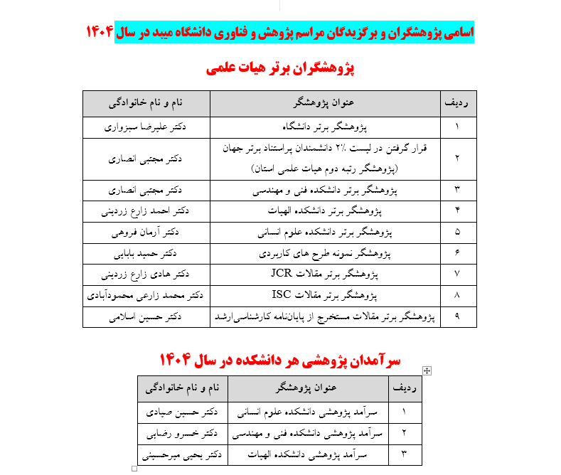 بخش پایانی مراسم، به معرفی و تجلیل از پژوهشگران برتر اختصاص داشت؛ در این بخش از 9 عضو هیئتعلمی به عنوان پژوهشگر برتر، 3 عضو هیئتعلمی به عنوان سرآمدان پژوهشی دانشکدهها، 15 دانشجو، 2 حوزوی شاخص در امر پژوهش و 3 دانشآموز پژوهشگر تجلیل به عمل آمد. همچنین از 4 تن از اساتید و کارکنان که در یک سال گذشته، در ترقی جایگاه دانشگاه در رتبهبندی جهانی RUR، رتبهبندی گرینمتریک و رتبهبندی دانشگاهها و مؤسسات پژوهشی جهان اسلام (ISC) بیشترین نقش را داشتهاند، تقدیر به عمل آمد. اسامی افراد تجلیل شده به شرح ذیل است: