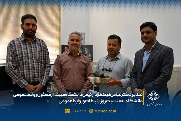 به مناسبت ۲۷ اردیبهشت، روز ارتباطات و روابط عمومی، دکتر عباس نیکنژاد، رئیس دانشگاه میبد، با حضور در روابط عمومی دانشگاه، از مسئول روابط عمومی دانشگاه، تقدیر کرد.